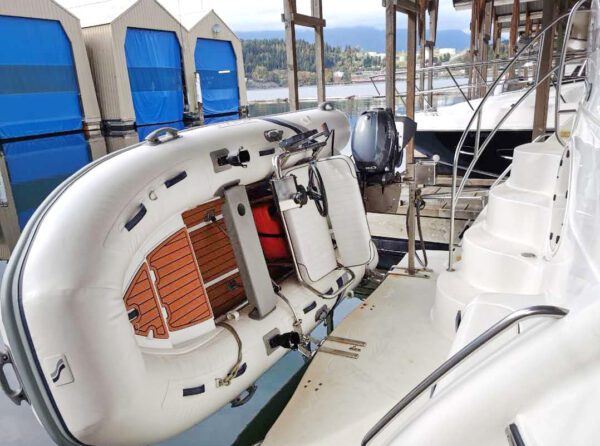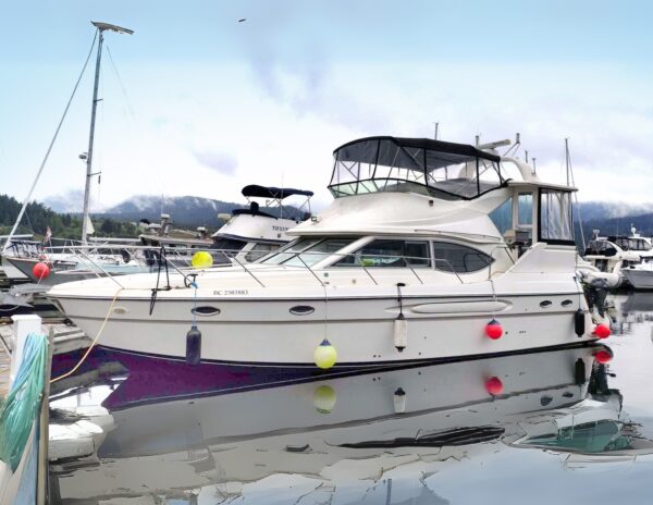 With an LOA of 42 feet and a generous beam, this yacht offers excellent interior volume and comfort. The flybridge and aft deck provide plenty of space for entertaining, while the molded steps ensure easy access throughout.