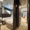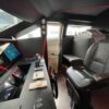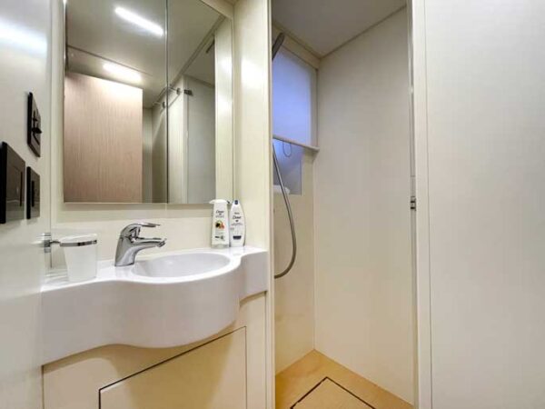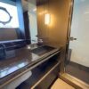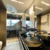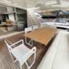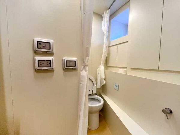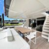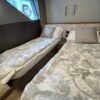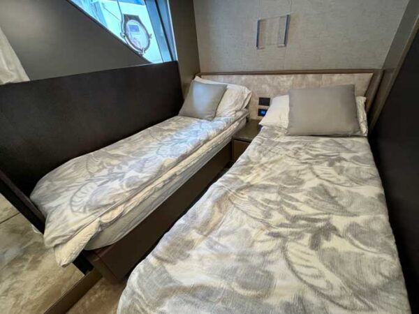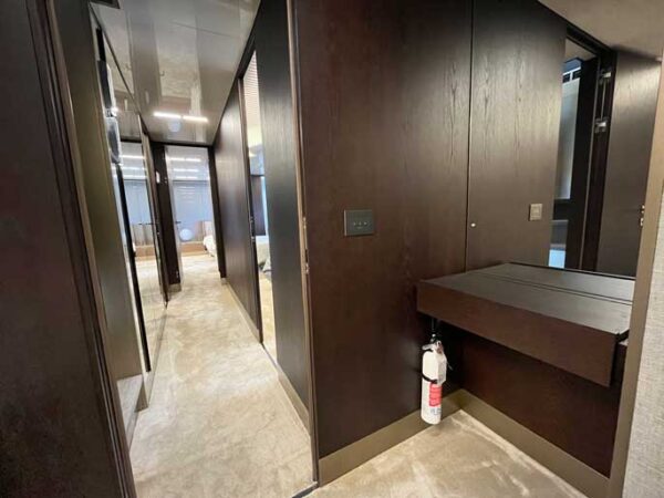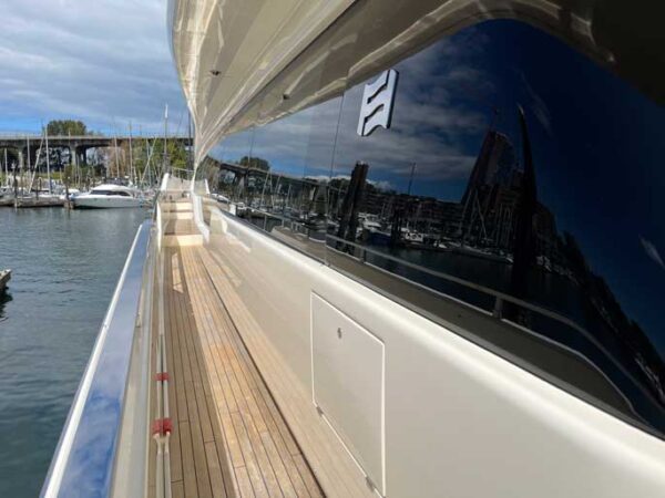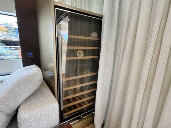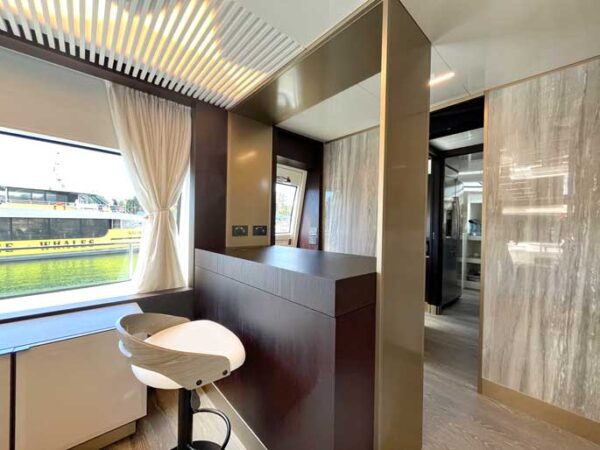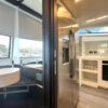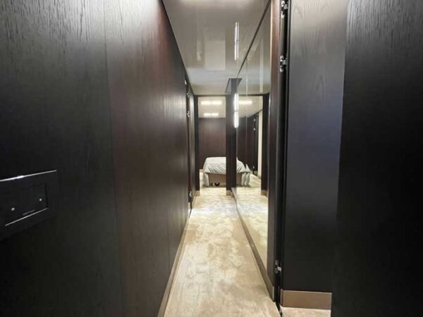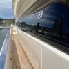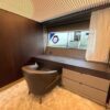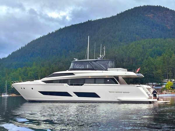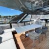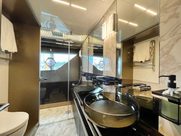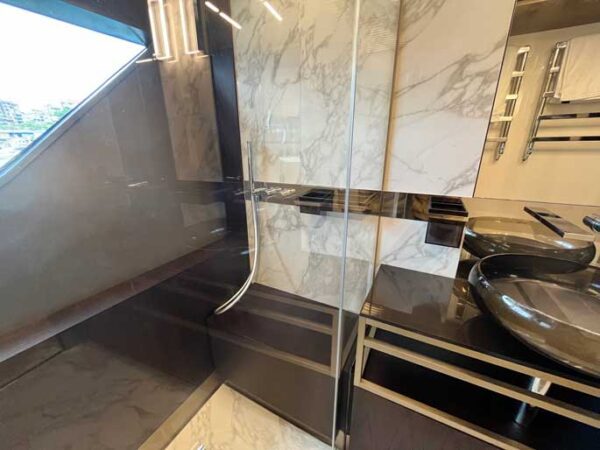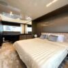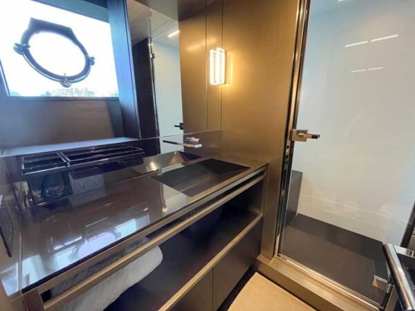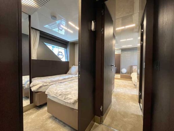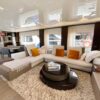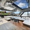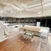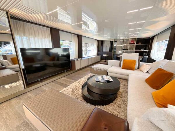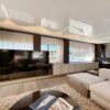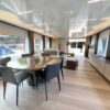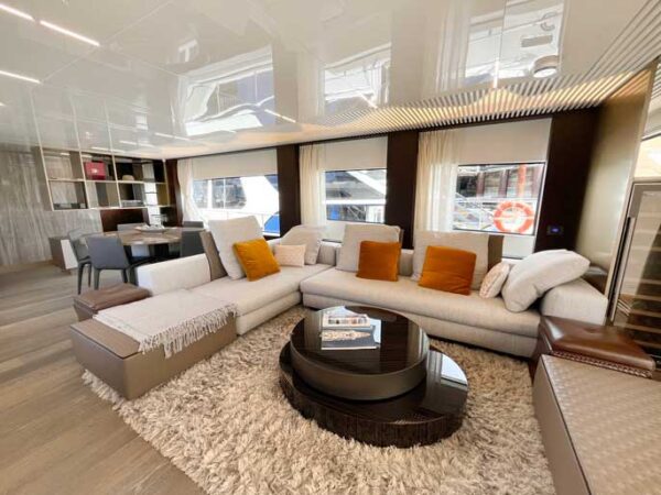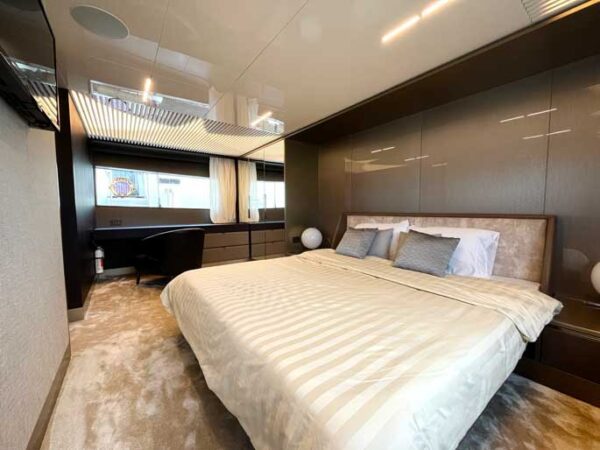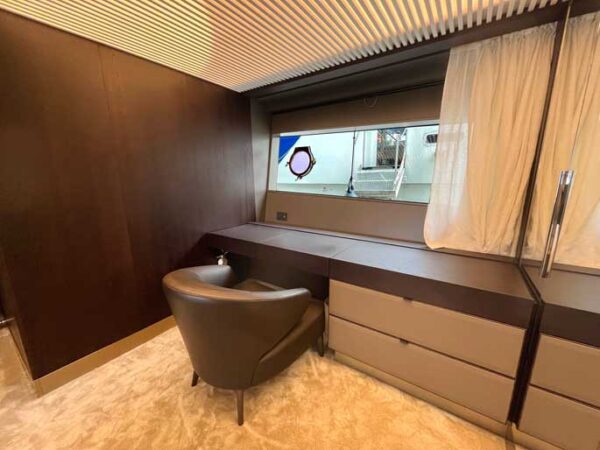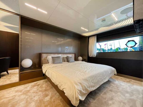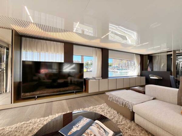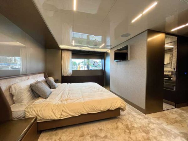 The main deck enhances the dynamism of the overall design: a single glazed expanse cuts through the entire superstructure to complement the fore-and-aft hard top over the raised helm station. The garage door tilts open with a special mechanism to reveal a beach area that eases below the water as a large submerged platform for guests to enjoy (and a handy way for the crew to manoeuvre the tender). Covered walls, floor-to-ceiling windows, billowy curtains and plenty of freestanding furnishings are the keys to a concept that is metropolitan yet liveable, ultracontemporary yet warm – and all in consummate Ferretti Yachts style.