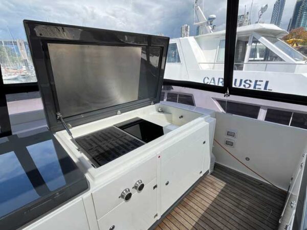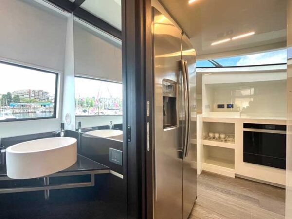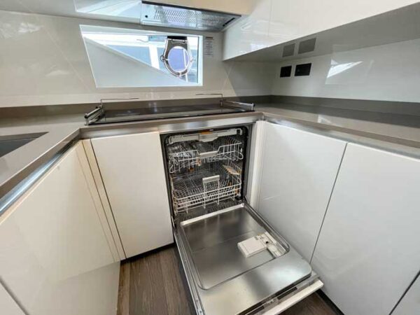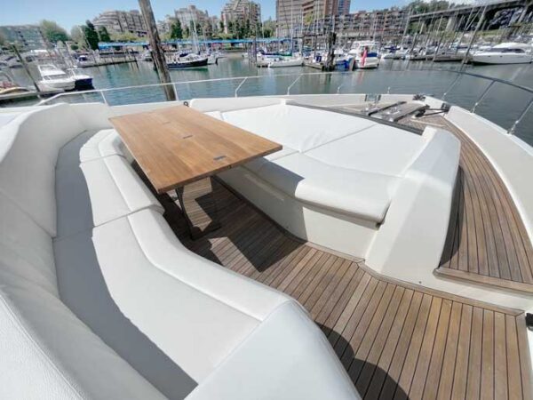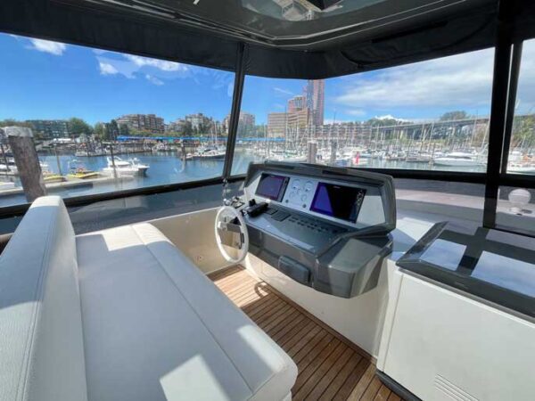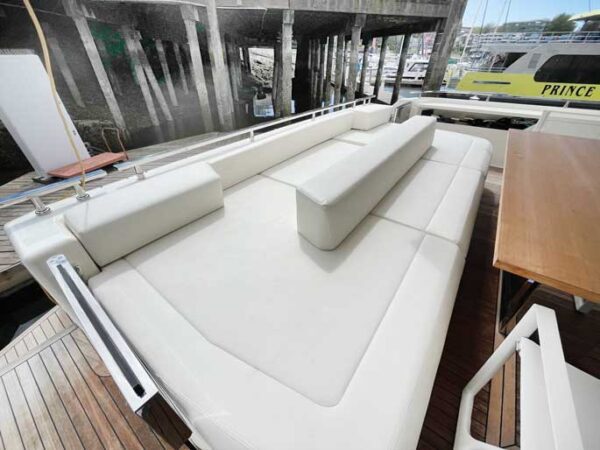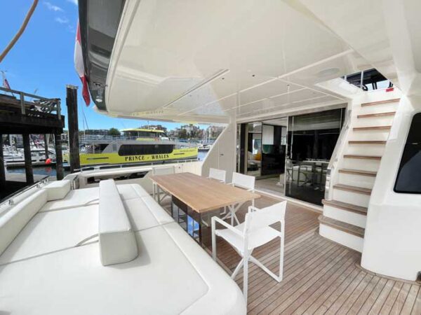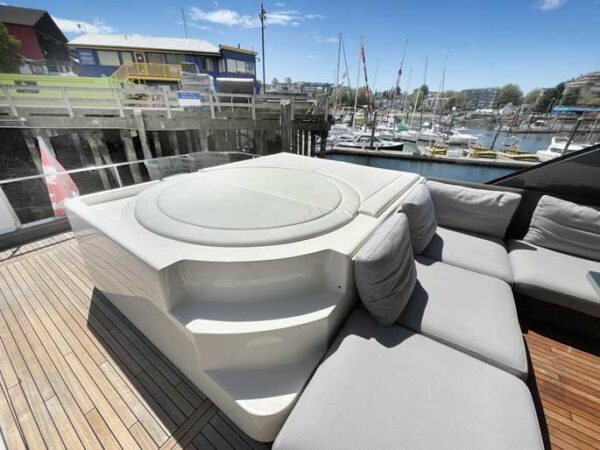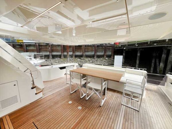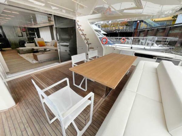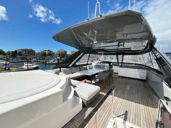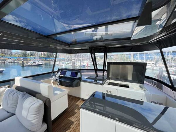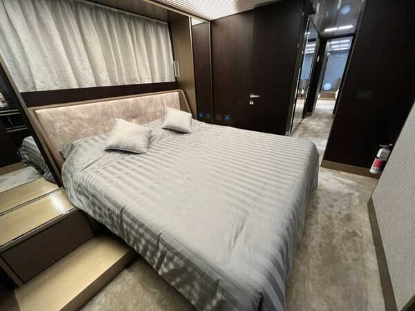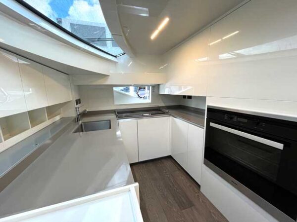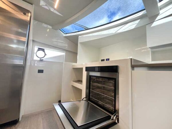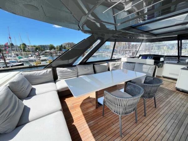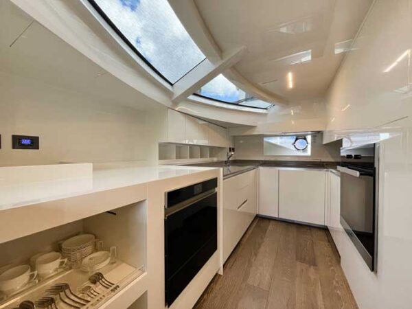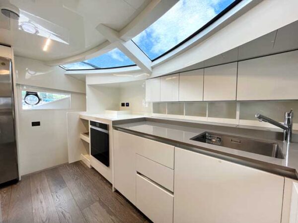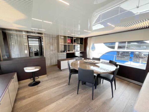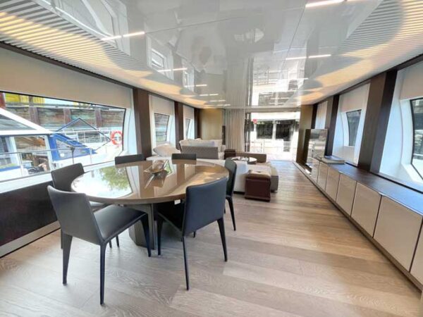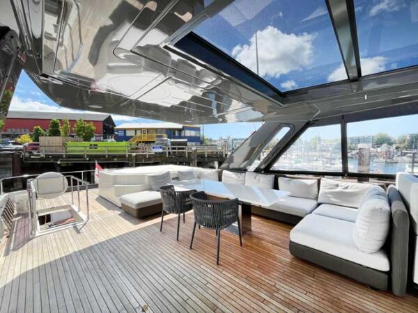 Luxury, power and style combine in a model with the dynamic, flowing lines to entrance the eye. Like a penthouse surrounded by the sea, this magnificent flybridge offers bright, airy accommodation elegantly furnished with refined design. With external areas affording every conceivable comfort, there’s an idyllic equilibrium between inside and out. And at 26 metres long and with a hull length under 24, the new flybridge can be registered as a pleasure boat.